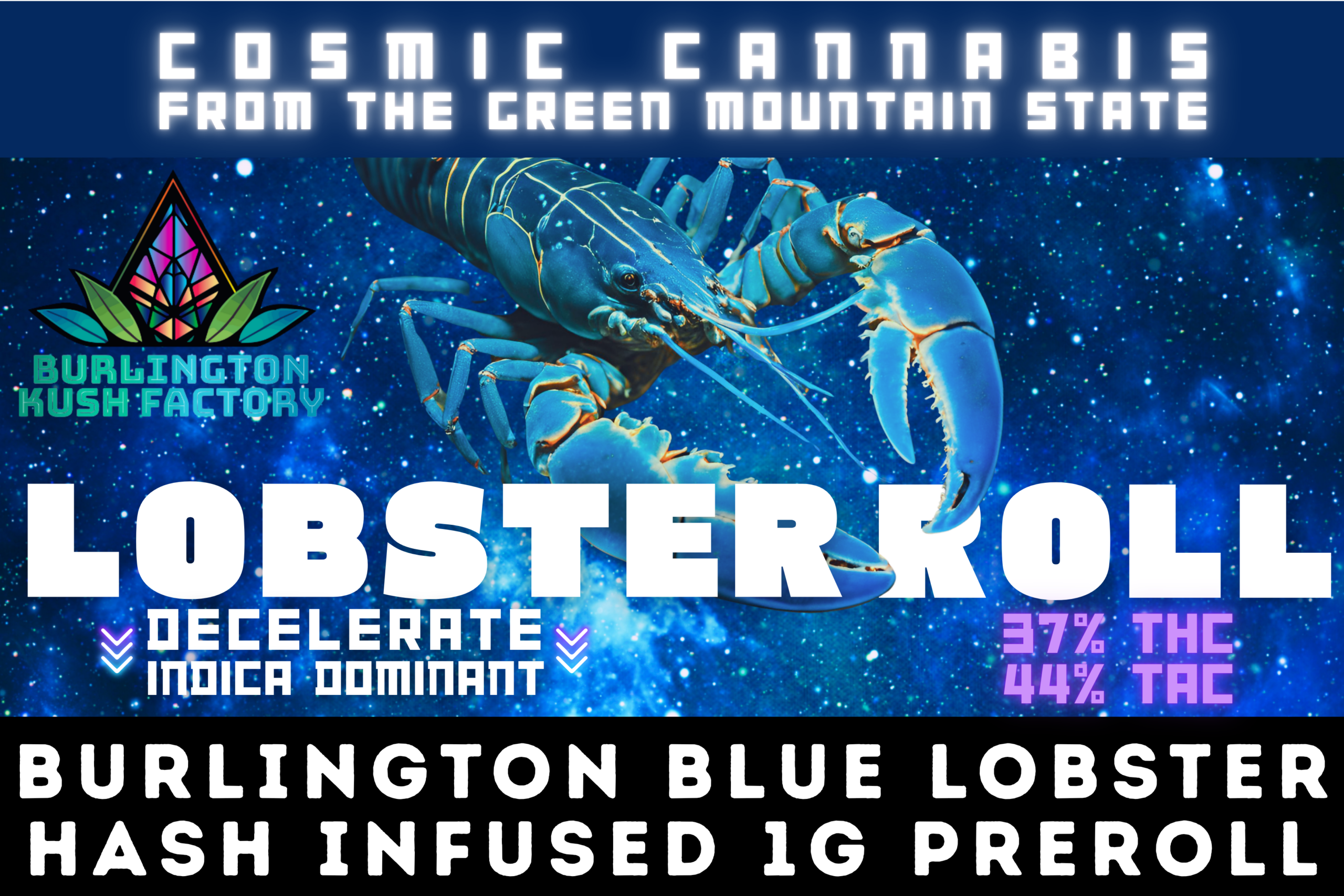 Plunge into the depths with Lobster Roll – a hash-infused preroll made from the exclusive Burlington Blue Lobster cultivar. Just like the elusive blue lobster, this infused preroll is one-of-a-kind, offering a cool, potent high that’s as rare as it is extraordinary.